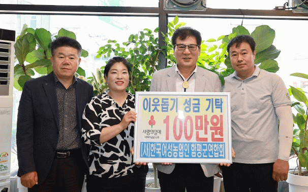 함평군은 2일 “(사)한국여성농업인함평군연합회이 제27회 함평나비대축제에 참여해 얻은 수익금 일부를 지역사회에 환원하기 위해 회원들이 뜻을 모아 지난달 29일 100만 원을 기부했다”고 밝혔다.