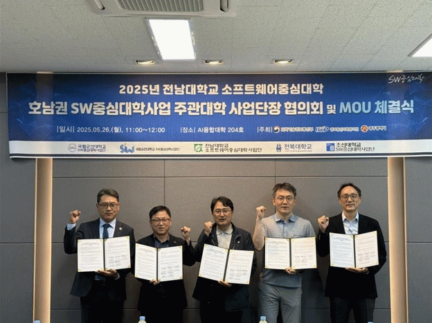 지난 26일(월) 전남대학교 AI융합대학에서 개최된 이번 행사에는 전남대학교, 국립군산대학교, 국립순천대학교, 전북대학교, 조선대학교 각 대학 SW중심대학사업단장이 한자리에 모여 ▲교육 콘텐츠 공동 개발 및 공유 ▲공동 교육과정 운영 ▲소프트웨어 경진대회 및 컨퍼런스 개최 ▲해외연수 프로그램 연계 등 실질적 협력방안을 논의했다.