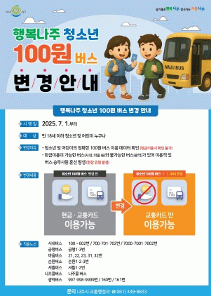 한편 ‘행복 나주 청소년 100원 버스’ 정책에 대한 세부 사항은 나주시청 누리집 또는 읍면동 행정복지센터, 각급 학교에서 확인할 수 있다.