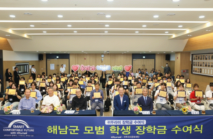 귀뚜라미 그룹 최진민 회장과 문화재단 관계자들이 참석한 가운데 열린 수여식에서는 해남군 중·고·대학생 70명에게 총 5,000만원의 장학금과 장학증서가 전달됐다.