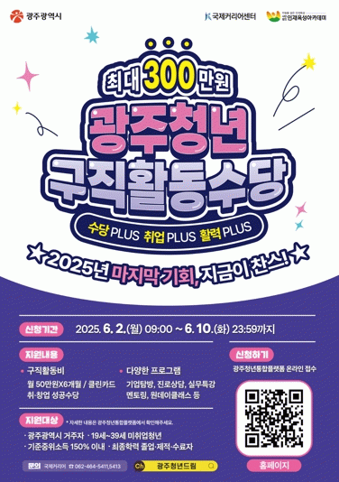 신청은 광주청년통합플랫폼을 통해 온라인으로 접수하면 된다. 광주시는 신청자의 가구소득, 미취업 기간, 구직활동계획 등을 종합적으로 평가해 6월 중 최종 대상자를 선발할 예정이다.