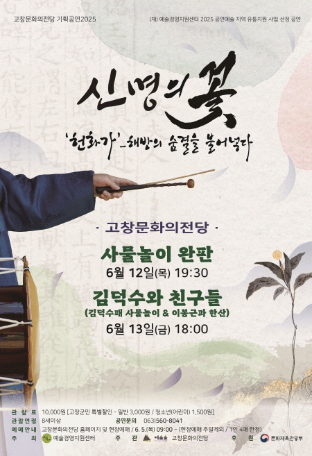 ‘신명의꽃–헌화가’는 총 2회에 걸친 두 마당으로 구성된다. 12일에는 김덕수를 중심으로 사물놀이 진쇠 등 최고의 기량을 갖춘 예인들이 문굿과 비나리, 삼도 설장구, 삼도 농악, 판굿으로 사물놀이 완판 공연을 선보인다.