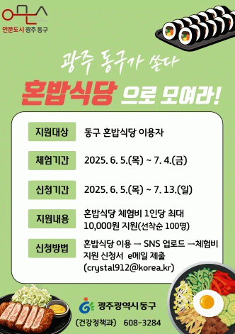 이번 이벤트는 동구 혼밥식당 이용 후기를 SNS 계정에 올려 혼밥식당을 적극 알리고, 지원비 신청서를 작성하면 된다. 지원비 신청은 7월 13일까지다.