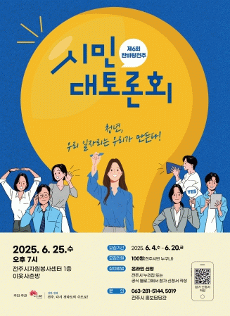 시는 오는 25일 오후 7시, 전주시자원봉사센터 1층 이웃사촌방에서 ‘청년, 우리 일자리는 우리가 만든다’를 의제로 ‘제6회 한바탕전주 시민대토론회’를 개최한다.