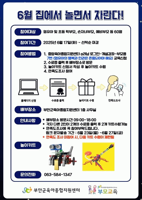키트 배부는 2025년 6월 17일부터 9시~18시까지(점심시간12시~13시 제외) 부안군육아종합지원센터 1층 사무실에서 선착순으로 진행되며, 수령 후 만족도 조사까지 진행된다.