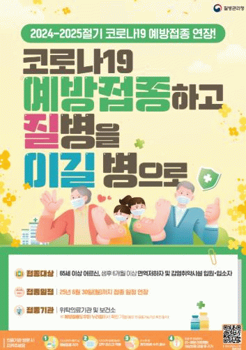 ‘2024~2025절기 코로나19 예방접종’기간을 기존 4월 30일에서 6월 30일까지 연장했으며, 무료 예방접종 대상은 ▲65세 이상 어르신(1959.12.31. 이전 출생자) ▲생후 6개월 이상 면역저하자 ▲감염취약시설 입원·입소자 등이다.