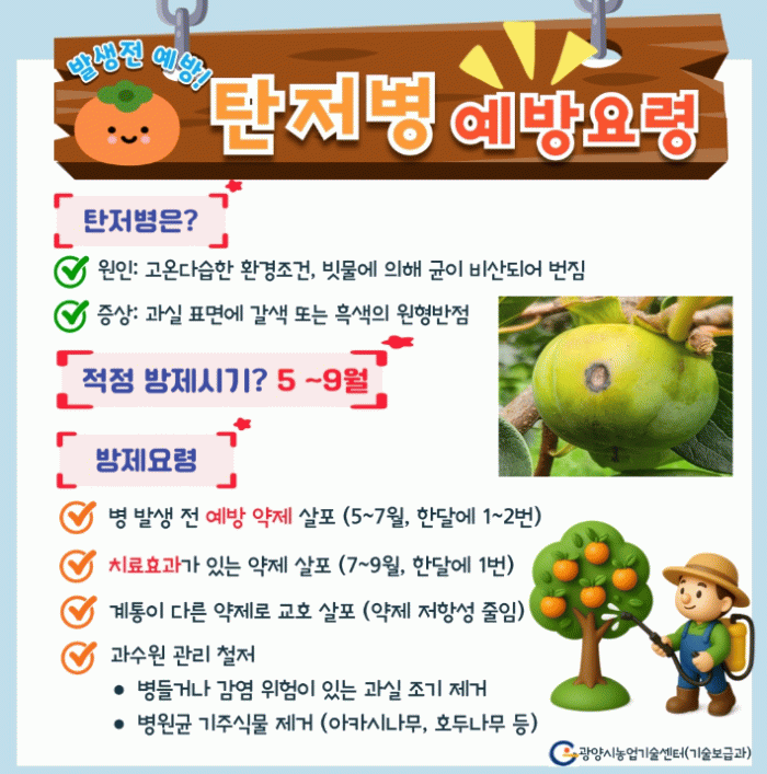 강인근 광양시 미래농업팀장은 “올해는 이상기후로 인해 과수 전반적으로 피해가 많이 발생하고 있으며, 탄저병 발병도 심화될 것으로 예상된다”며 “감은 탄저병에 매우 취약한 작물이므로 농가별로 과원을 세심하게 관리해야 한다”고 강조했다.