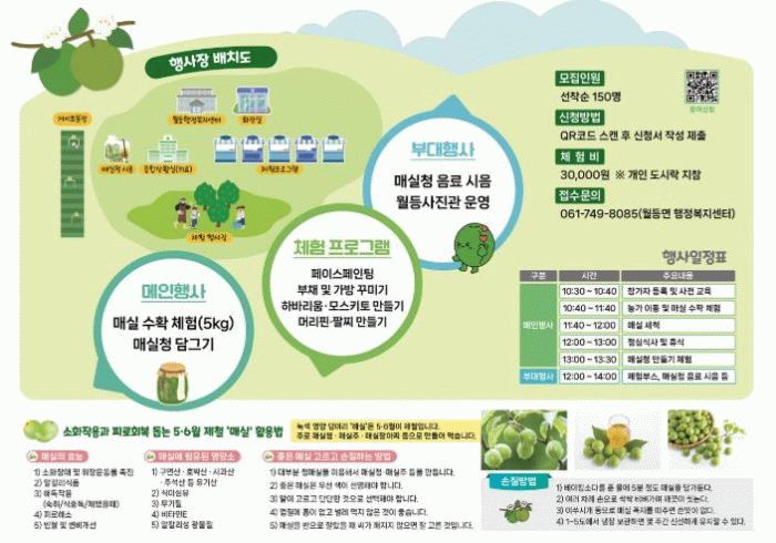 또한, 매실 수확 체험과 함께 하바리움․모스키토 만들기, 부채 꾸미기 등 체험 부스를 비롯하여 월등면 매실로 만든 매실청 시음, 폴라로이드 사진 촬영 등 부대행사까지 알차게 구성되어 있다.