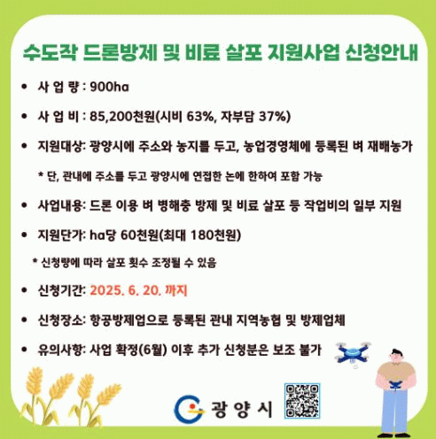 우미자 광양시 스마트원예과장은 “기후변화로 각종 병해충 발생이 증가하고 있어 적기 방제가 무엇보다 중요하다”며 “사업 확정 시기인 6월 말 이후에는 신청이 불가하므로 반드시 기간 내에 신청해 주시길 바란다”고 당부했다. 이어 “고품질 쌀 생산은 물론, 농촌지역의 노동력 부족 해소와 경영비 절감에 기여할 수 있도록 최선을 다하겠다”고 밝혔다.