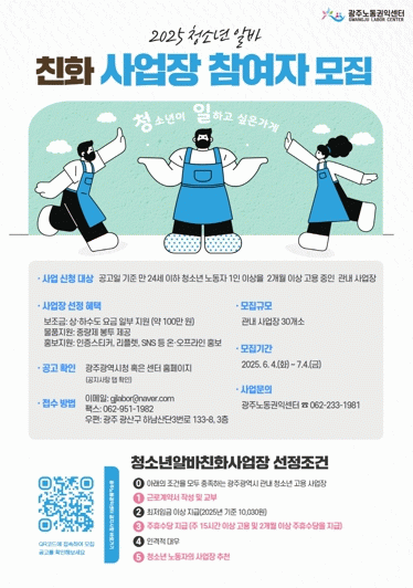‘청소년 알바 친화사업장’은 24세 이하 청소년을 고용하는 광주지역 사업장 중 근로기준법 등 관련 법령을 준수하며 청소년들이 안심하고 일할 수 있는 환경을 제공하는 사업장이다.