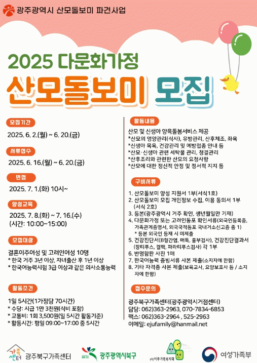한편 산모돌보미 서비스 이용을 원하는 다문화가정 결혼이주여성 산모와 고려인여성 산모는 ‘다문화가정 산모돌보미 서비스 이용가정 모집’에 신청하면 된다. 광주북구가족센터 누리집을 통해 신청서 등을 내려받아 작성한 뒤 관련 서류와 함께 광주북구가족센터로 내방, 접수하면 된다. 연중 모집 중으로, 서비스 이용료는 무료다. 자세한 문의는 광주북구가족센터로 하면 된다.
