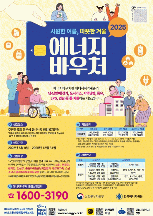 에너지바우처는 취약계층이 냉·난방 이용에 필요한 에너지(전기·도시가스·지역난방·등유·LPG·연탄 등) 구입비용을 지원하는 사업으로, 지원금액은 1인 세대 29만 5,200원, 2인 세대 40만 7,500원, 3인 세대 53만 2,700원, 4인 이상 세대 70만 1,300원이다.