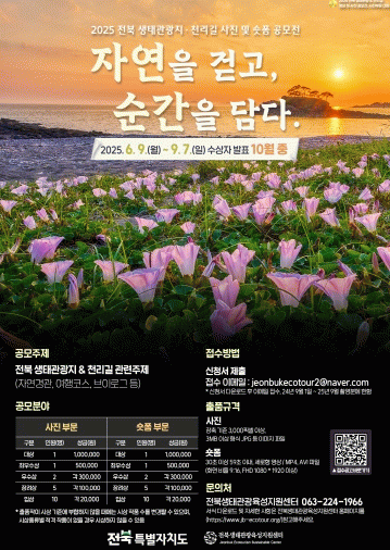작품 접수는 전북생태관광육성지원센터 누리집에서 신청서를 내려받아, 응모 작품과 함께 이메일로 제출하면 된다.
