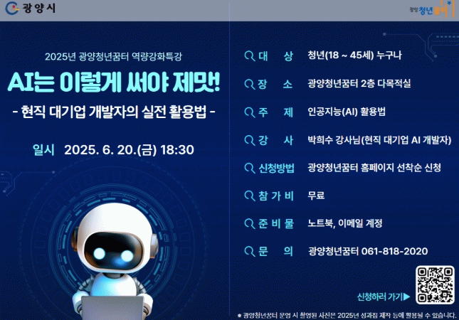오영숙 광양청년꿈터 센터장은 “AI 기술은 더 이상 일부 전문가만의 영역이 아니라 모든 청년에게 필요한 필수 역량”이라며 “이번 특강이 AI 기술에 대한 문턱을 낮추고, 청년들이 디지털 사회에 주도적으로 참여할 수 있는 계기가 되길 바란다”고 말했다.