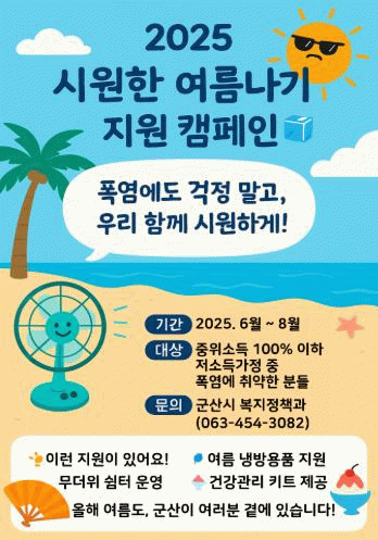 ‘2025년 저소득가정 건강한 여름나기 캠페인’ 후원에 관한 자세한 사항은 군산시 복지정책과를 통해 안내받을 수 있다.