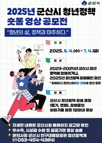 이번 공모전은 “청년의 삶, 정책과 마주하다”를 주제로, 군산시 청년정책에 참여했던 경험 또는 현재 참여 중인 사례를 1분 이내 영상으로 제작하는 방식으로 진행된다.