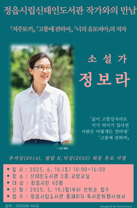 정읍시는 ‘저주토끼’의 저자이자 국내외에서 활발히 활동 중인 소설가 정보라 작가가 오는 14일 오후, 신태인도서관에서 강연을 진행한다고 10일 밝혔다.
