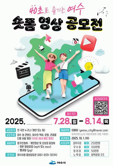 대한민국 국민이면 누구나 참여할 수 있으며, 최신 추세(트렌드)를 반영해 여수의 섬·역사·문화·관광 등을 40초 이내 세로 규격 영상에 담으면 된다.