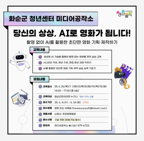 조미화 인구청년정책과장은 “생성형 AI를 활용한 단편 영화 제작 교육을 통해 화순군민들이 창의적인 아이디어를 실제 영화로 구현하고, 자신만의 이야기를 영화로 만들어보는 소중한 경험이 되기를 기대한다”라고 말했다.