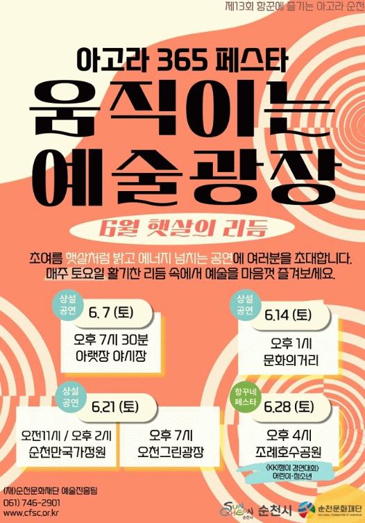 6월 아고라 순천 상설공연의 자세한 일정은 순천문화재단 누리집과 2025 아고라 순천 네이버 밴드를 통해 확인 가능하다.
