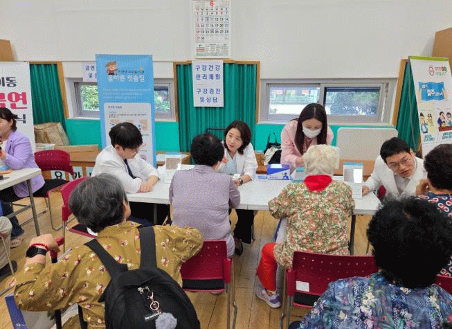 현장에는 구강보건 검진차량이 배치되어 어르신들을 대상으로 구강검진 및 상담이 이뤄졌고, 치면세균막 검사 후 칫솔질 교육도 함께 진행됐다.
