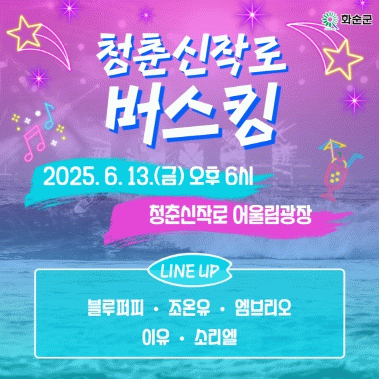 청춘신작로 버스킹은 오는 10월까지 매주 금요일 오후 6시 정기적으로 열리며, 화순군은 이를 통해 청춘신작로 일대를 일상 속 문화공간이자, 세대를 잇는 열린 무대로 조성해 나갈 계획이다.