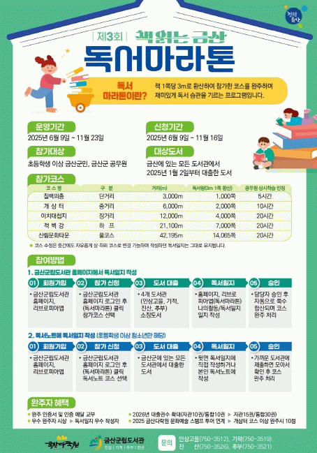 군 관계자는 “이번 독서마라톤이 어린이, 청소년은 물론 지역 주민 모두가 책을 통해 성취감을 느낄 수 있는 계기가 되길 바란다”며 “참여율을 높이기 위해 일지 작성 횟수 제한을 유연하게 운영하고 기존 군립도서관 4개소 중심에서 공·사립 작은도서관, 금산도서관, 학교 도서관까지 장소도 확대했다”고 말했다.