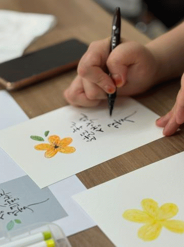 수채 캘리그라피는 수성펜과 붓펜을 이용한 수업으로 완주군 지역주민의 정서 함양과 자신감 회복을 돕는 프로그램이다.