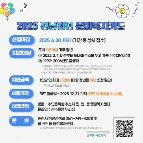 시 관계자는 “전남청년 문화복지 카드 지원사업이 일상에 지친 청년들에게 조금이나마 도움이 되길 바란다”며 “다양한 정책이 일상에서 체감될 수 있도록 아낌없는 노력과 지원을 다하겠다”고 말했다.