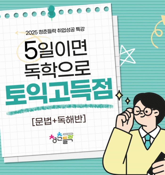 토익 문법·독해 수업은 취업을 준비하는 청년들의 외국어 역량 강화를 위한 과정으로, 문법 이론과 독해 중심의 강의, 실전 문제 풀이 등을 통해 효율적인 점수 향상을 목표로 한다. 수업은 6월 28일 토요일부터 7월 26일 토요일까지 매주 토요일 오후 2시부터 총 5회에 걸쳐 진행한다.