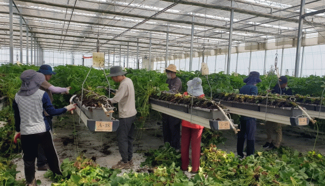 이날 오형석 교통행정과장을 포함한 직원들은 2,400평 규모의 딸기 비닐하우스에서 높은 기온에서 불구하고 딸기 수확 이후 필요한 딸기 순, 농장 정리 작업에 매진하며 구슬땀을 흘렸다.