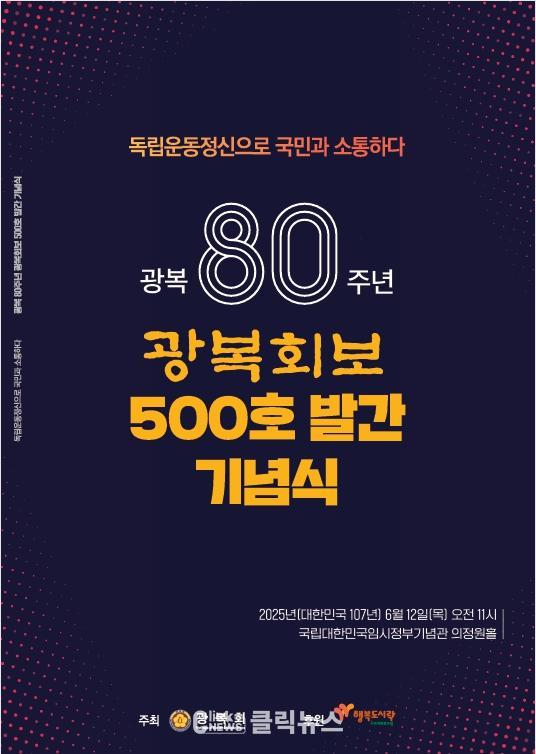 이 회장은 또한 “독립운동 선열들은 자주독립뿐만 아니라, 100년을 붙임 광복 80주년·광복회보 500호 발간 기념식 포스터내다보며 인류문화 발전에 기여하는 꿈을 꾸셨다. 광복회보 발행인으로서 광복회보가 대한민국 정체성을 지켜내는 위대한 기록문화유산으로 남을 수 있도록 최선을 다하겠다.”고 말했다.
