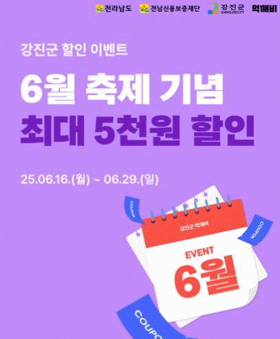 ‘제3회 강진 수국길 축제’ 개최 전 6월 23일 월요일부터 6월 26일 목요일까지는 매일 선착순 200명에게 2천 원 할인쿠폰이, 축제 기간인 6월 27일 금요일부터 6월 29일 일요일까지는 최대 5천 원 할인쿠폰이 제공된다.
