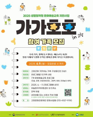 조창환 고창문화관광재단 상임이사는 “이번 사업은 가족이 함께 예술을 통해 서로를 이해하고 치유하는 특별한 시간이 될 것”이라며, “많은 가족들이 참여해 특별한 추억을 쌓기를 바란다.”고 전했다.