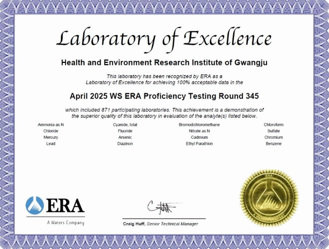 정현철 보건환경연구원장은 “국제숙련도 평가를 통해 연구원의 분석능력 우수성을 다시 확인할 수 있는 계기가 됐다”며 “앞으로도 연구원의 검사 전문성과 데이터 신뢰도를 높여 시민이 먹는물을 안심하고 마실 수 있도록 노력하겠다”고 말했다.