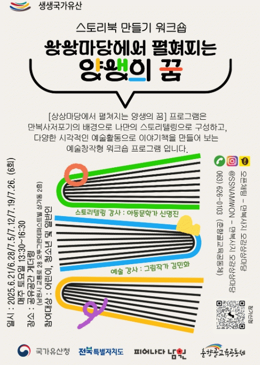 『상상마당에서 펼쳐지는 양생의 꿈』 은 6월 21일 1회로 시작하여, 6월 28일(2회), 7월 5일(3회), 7월 12일(4회), 7월 19일(5회), 7월 26일(6회)로 총6회로 진행 될 예정이다. 본 행사는 국가유산청, 전북특별자치도, 남원시가 주최하고, 춘향골교육공동체가 주관하며, 참가신청은 춘향골교육공동체 홍보담당에게 신청 할 수 있다.
