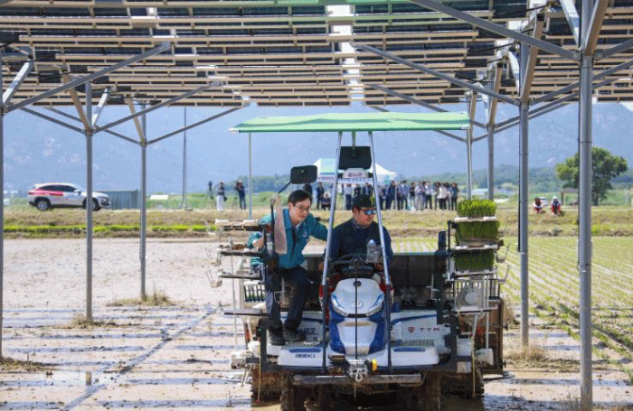 우승희 영암군수 등은 영농형 태양광 구조물 아래에서 모내기 작업이 이뤄지는 시연회를 보며 시스템 안에서 기계화 영농이 문제없음을 확인했다.