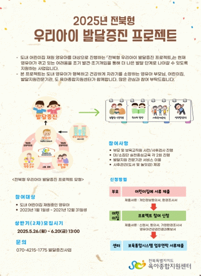 박장석 전북자치도 사회복지정책과장은 “영유아 시기는 인간 발달의 골든타임으로, 이 시기의 적절한 개입은 아이의 미래를 크게 바꿀 수 있다”며 “전북자치도는 도내 모든 아이들이 발달의 기회를 놓치지 않도록 보다 정밀하고 촘촘한 지원체계를 만들어 나가겠다”고 말했다.