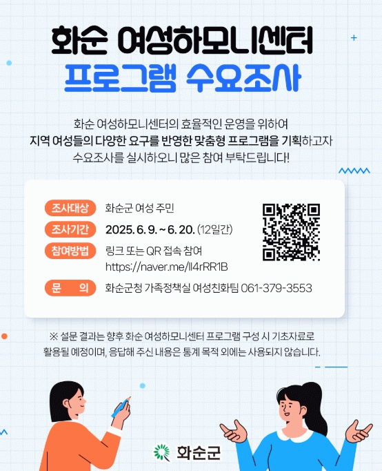 이번 수요 조사는 화순군에 거주하는 여성을 대상으로 하며, QR코드 스캔 또는 온라인 링크 접속을 통해 간편하게 참여할 수 있다.