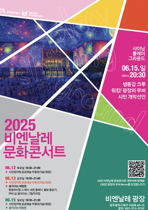 2025 비엔날레 문화콘서트는 10월까지 총 15회에 걸쳐 진행되며, 여름에는 성인을 위한 예술 휴가와 어린이·청소년을 위한 여름방학 특집, 가을에는 광주디자인비엔날레와 연계한 시민 참여형 예술 프로젝트가 이어진다.