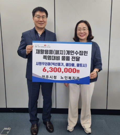 이금안 전주시 노인복지과장은 “무더운 날씨에도 생계를 위해 폐지를 수거하는 어르신들에게 조금이나마 힘이 됐으면 하는 마음에서 폭염대비 시원꾸러미를 준비했다”면서 “앞으로도 재활용품을 수집하며 생활하는 취약계층 어르신들을 위해 많은 관심을 기울이도록 노력하겠다”고 말했다.