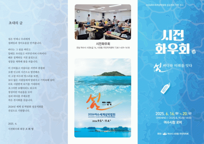 이번 전시회는 2026여수세계섬박람회 성공개최를 기원하기 위한 것으로, “섬, 바다와 미래를 잇다”라는 섬 박람회와 같은 주제로 마련된다.