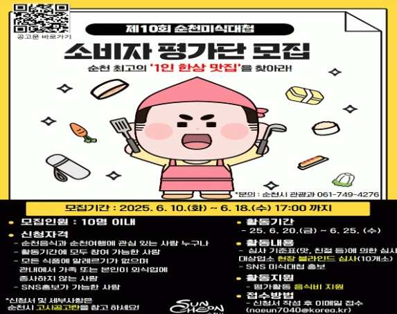 시 관계자는 “이번 소비자 평가단의 목소리는 향후 순천미식대첩의 콘텐츠 개선뿐만 아니라, 지속 가능한 미식 관광 자원을 발전시키는 데 큰 밑거름이 될 것”이라며, “순천을 찾는 관광객들에게 진정성 있는 미식 경험을 제공하는 첫걸음이 될 수 있도록 많은 관심과 참여를 바란다”고 밝혔다.