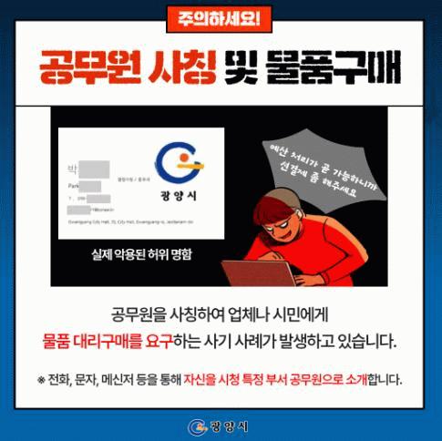 시 관계자는 “최근 들어 광양시청 직원을 사칭한 인물이 도매업체에 선금을 요구하고 고가의 물품을 주문한 뒤 이를 수령하지 않고 사라지는 이른바 ‘노쇼(No-show) 사기’ 시도가 빈번하게 발생하고 있다”며 “이들 사례는 모두 실존 공무원의 이름과 부서를 도용하고, 정교하게 위조된 명함을 통해 신뢰를 얻은 뒤 고가 물품 주문을 유도하는 방식으로 이뤄지고 있다”고 말했다.