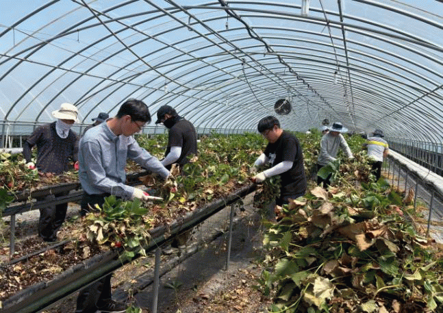 이번 일손돕기는 허리디스크 수술로 영농활동이 어려운 김지효(58세·화전발산길 11-18) 농가의 시설하우스(딸기) 2동, 약 600평(1,997㎡) 규모의 딸기 모종 제거 작업이 진행됐다.