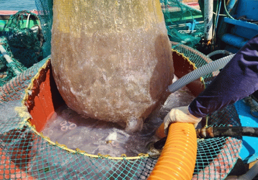 이날 훈련에는 지휘선 1척, 예찰선 1척, 정화선 1척, 어선 7척을 동원해 ▲해파리 주의 특보 발령 ▲예찰선을 통한 해파리 밀도 관측 ▲정화선 및 어선을 활용한 해파리 제거 작업이 순차적으로 이뤄졌다. 해파리는 그물을 이용해 포획한 뒤 분쇄기를 이용해 분쇄하고, 절단망을 활용해 제거하는 일련의 대응 과정을 훈련했다.