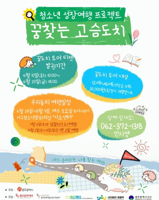 2025년도 광주문화재단 예술시민문화예술교육 지원사업으로 운영되는 “청소년성장여행프로젝트, 꿈찾는고슴도치”는 꿈을 찾고 싶은 청소년들에게 학교 안의 배움과는 다른 지점의 배움을 경험할 수 있는 아지트를 제공하고 청소년들이 자신만의 희노애락과 취향을 발견하고 또래와의 어울림을 통해 자기이해 및 자기탐색 경험의 시간을 지원하고자 한다. 또한 자신의 꿈을 ’직업‘ 대신 스스로의 가치관에 대해 이야기하도록 청소년들을 이끌어나감으로써 주도적이며 몸과 마음이 건강한 청소년으로 성장을 목적으로 한다.