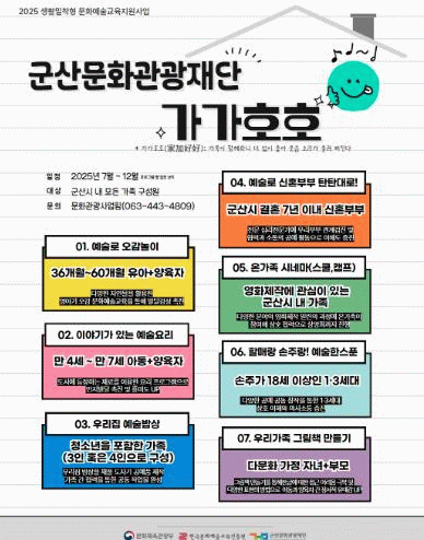 이번 사업은 군산시에 거주하는 다양한 가족 유형을 대상으로 총 7개의 가족 중심 프로그램으로 구성되어 있으며, 1차 모집은 오는 16일부터 30일까지 진행된다.