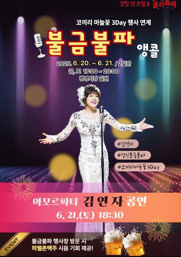 앵콜 운영 이벤트로 지난 2024년 하반기 10월, 불금불파 피날레 공연을 마치고 돌아갔던 아모르파티의 주인공, 김연자 가수를 6월 21일에 다시 초청해 다시 한 번 무대를 뜨겁게 달굴 예정이다.