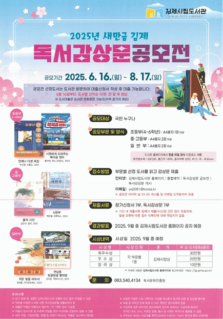 정성주 김제시장은 “이번 공모전이 독서를 사랑하는 진심을 나누는 소중한 장이 되길 바란다”며 “김제시는 앞으로도 책을 매개로 한 독서 문화 확산에 최선을 다하겠다.”고 전했다.